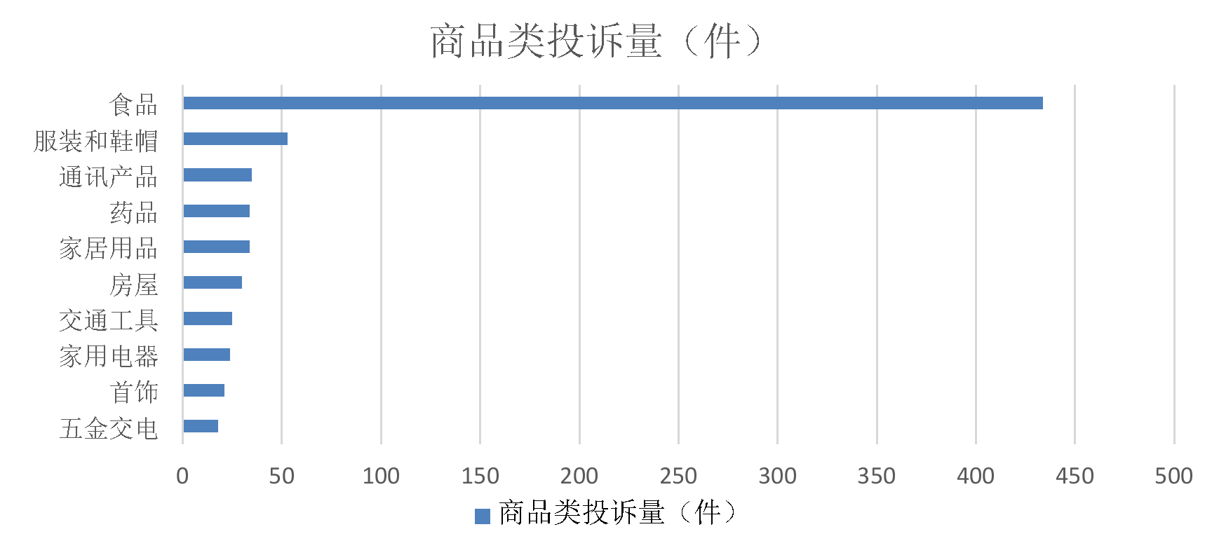 2024年上半年,商品类投诉排名前十位的是:食品(434件)、服装和鞋帽(53件)、通讯产品(35件)、药品(34件)、家居用品(34件)、房屋(30件)、交通工具(25件)、家用电器(24件)、首饰(21件)、五金交电(18件)。