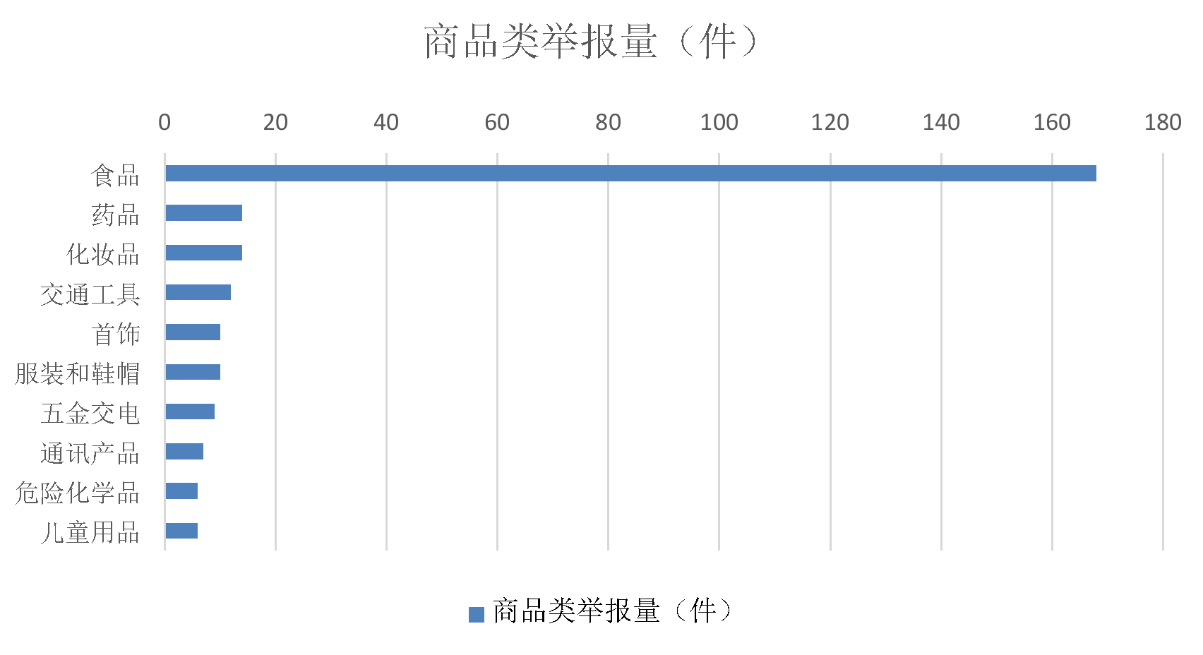 2024年上半年,商品类举报排名前十位的是:食品(168件)、药品(14件)、化妆品(14件)、交通工具(12件)、首饰(10件)、服装和鞋帽(10件)、五金交电(9件)、通讯产品(7件)、危险化学品(6件)、儿童用品(6件)。