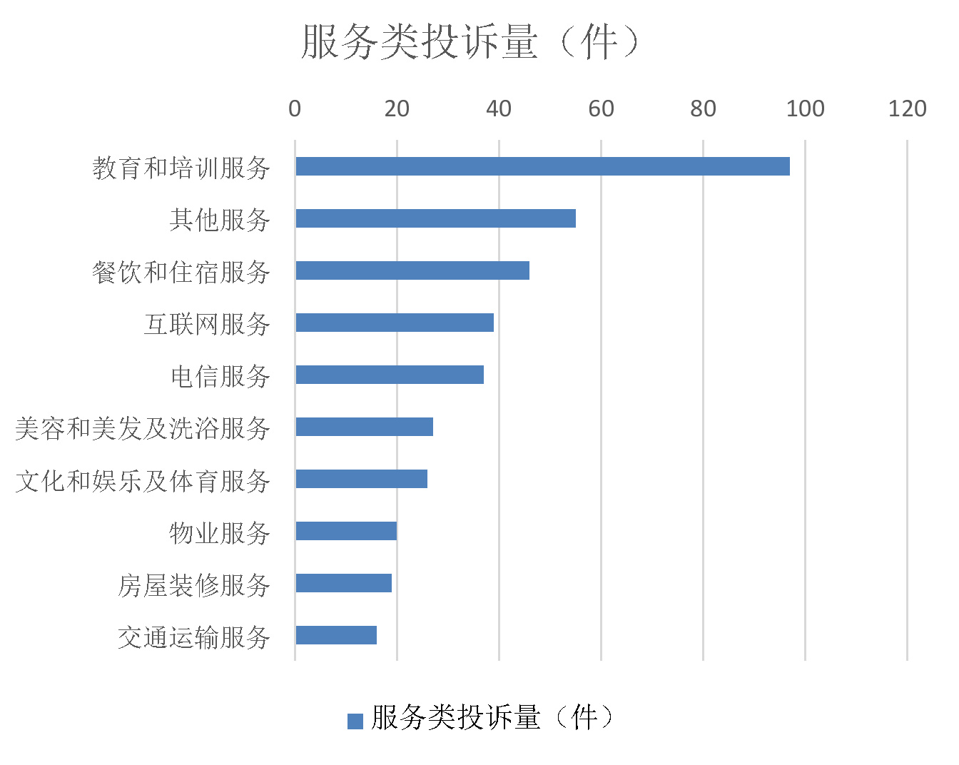 2024年上半年,服务类投诉排名前十位的是:教育和培训服务(97件)、其他服务(55件)、餐饮和住宿服务(46件)、互联网服务(39件)、电信服务(37件)、美容和美发及洗浴服务(27件)、文化和娱乐及体育服务(26件)、物业服务(20件)、房屋装修服务(19件)、交通运输服务(16件)。