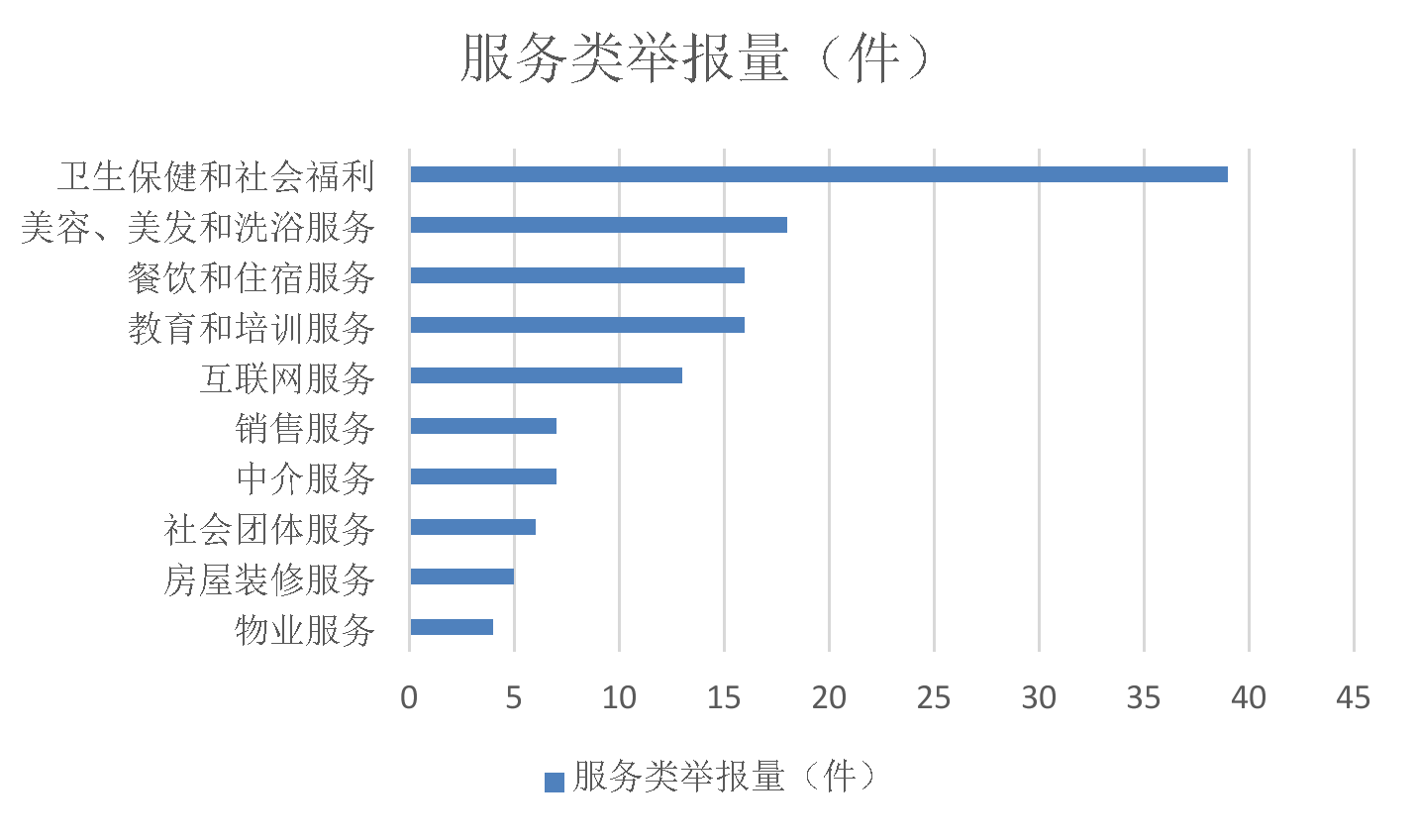 2024年上半年,服务类投诉排名前十位的是:卫生保健和社会福利(39件)、美容和美发及洗浴服务(18件)、餐饮和住宿服务(16件)、教育和培训服务(16件)、互联网服务(13件)、销售服务(7件)、中介服务(7件)、社会团体服务(6件)、房屋装修服务(5件)、物业服务(4件)。