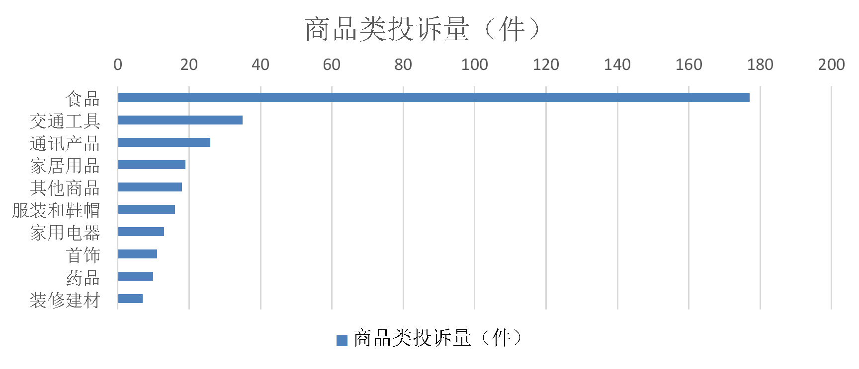 2024年7月,商品类投诉排名前十位的是:食品(177件)、交通工具(35件)、通讯产品(26件)、家居用品(19件)、其他商品(18件)、服装和鞋帽(16件)、家用电器(13件)、首饰(11件)、药品(10件)、装修建材(7件)。
