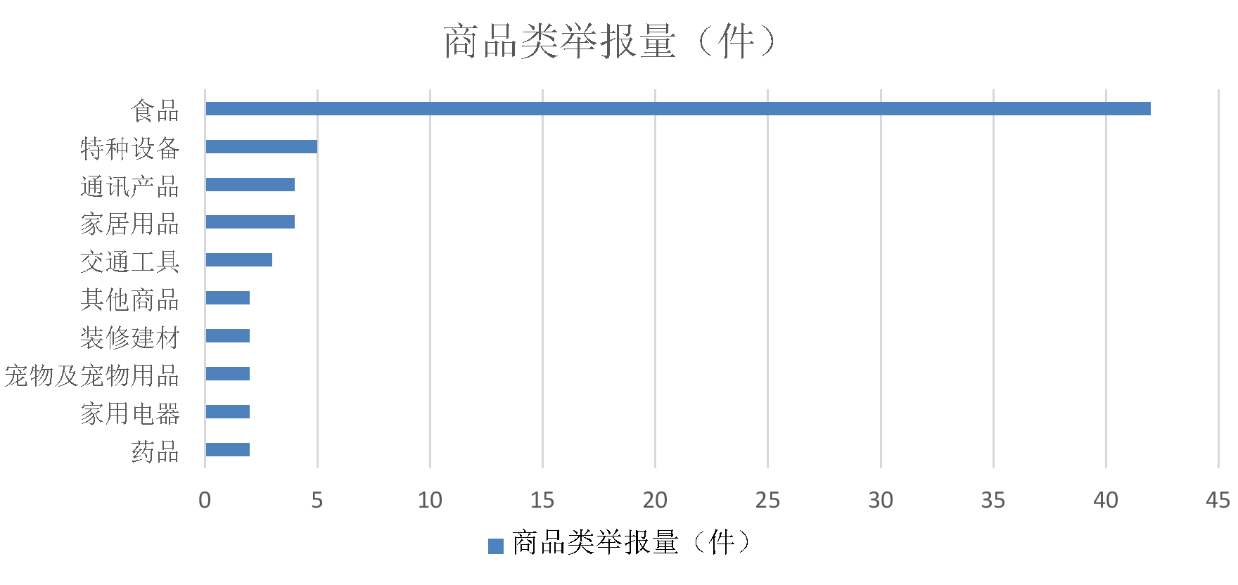 2024年7月,商品类举报排名前十位的是:食品(42件)、特种设备(5件)、通讯产品(4件)、家居用品(4件)、交通工具(3件)、其他商品(2件)、装修建材(2件)、宠物及宠物用品(2件)、家用电器(2件)、药品(2件)。