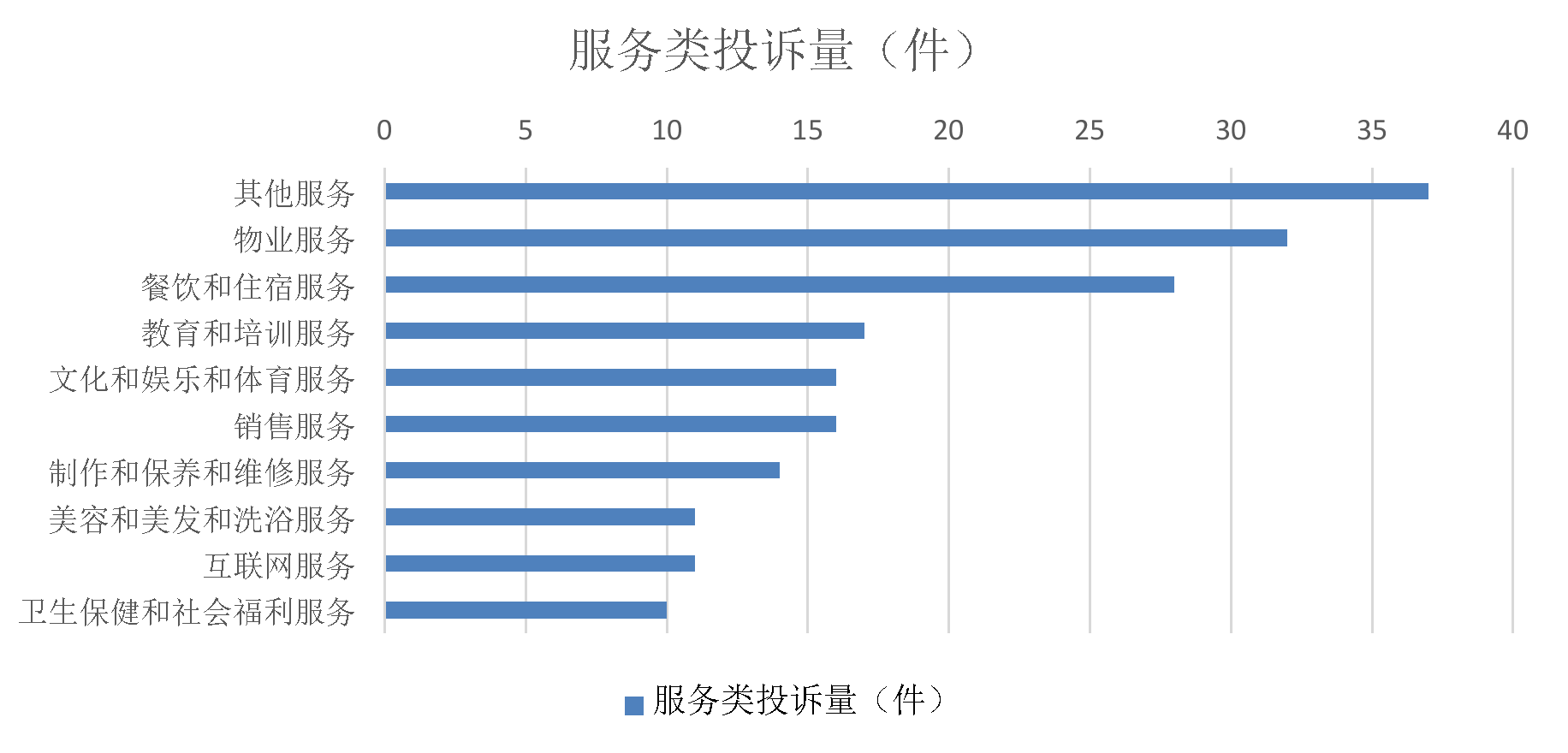 2024年7月,服务类投诉排名前十位的是:其他服务(37件)、物业服务(32件)、餐饮和住宿服务(28件)、教育和培训服务(17件)、文化和娱乐和体育服务(16件)、销售服务(16件)、制作和保养和修理服务(14件)、美容和美发和洗浴服务(11件)、互联网服务(11件)、卫生保健和社会福利服务(10件)。