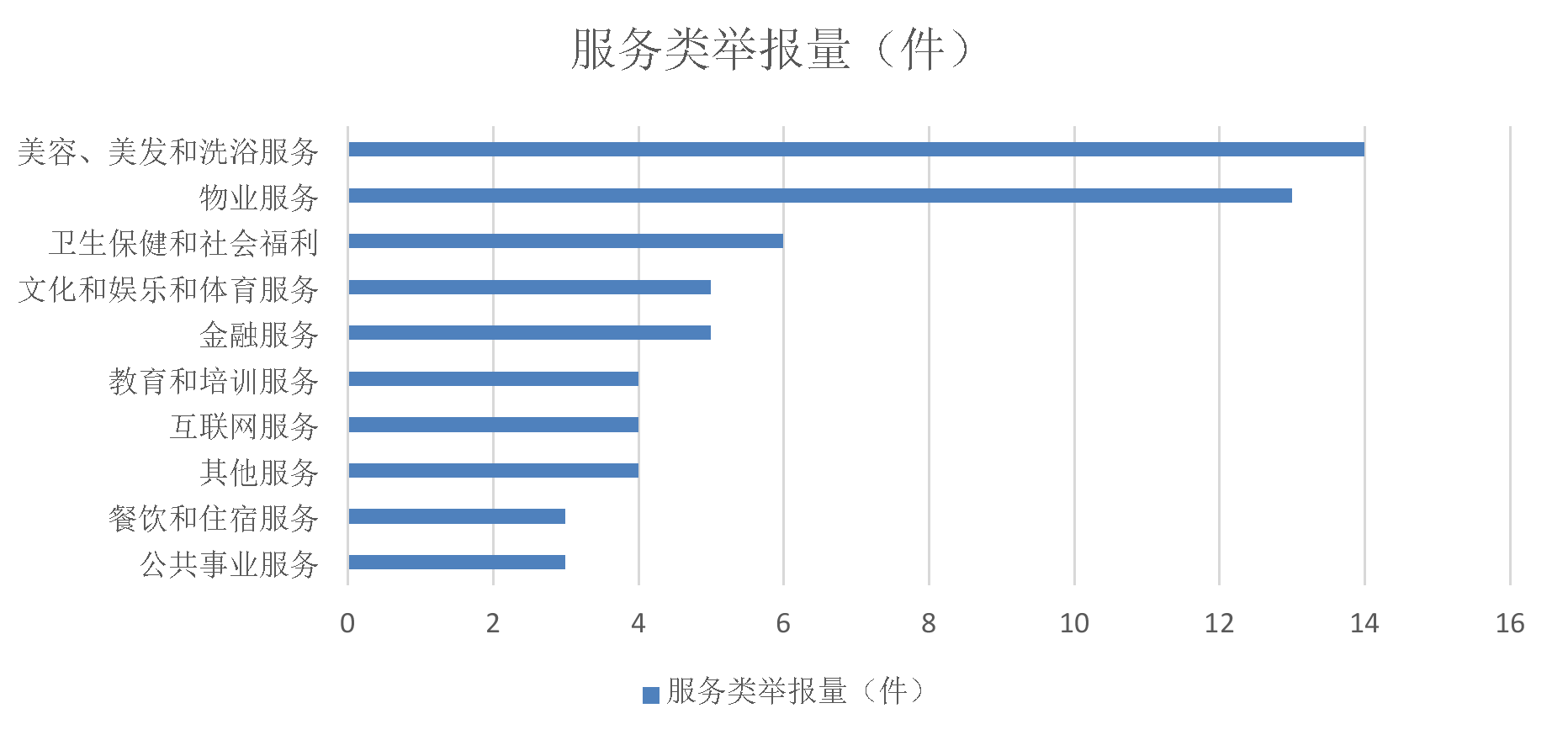 2024年7月,服务类投诉排名前十位的是:美容和美发和洗浴服务(14件)、物业服务(13件)、卫生保健和社会福利(6件)、文化和娱乐和体育服务(5件)、金融服务(5件)、教育和培训服务(4件)、互联网服务(4件)、其他服务(4件)、餐饮和住宿服务(3件)、公共事业服务(3件)。