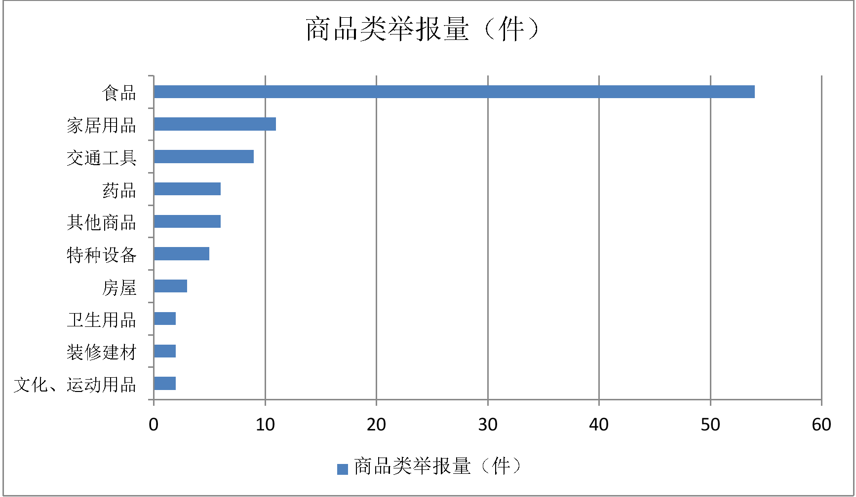 2024年8月,商品类举报排名前十位的是:食品(54件)、家居用品(11件)、交通工具(9件)、其他商品(6件)、药品(6件)、特种设备(5件)、房屋(3件)、文化、运动用品(2件)、装修建材(2件)、卫生用品(2件)。