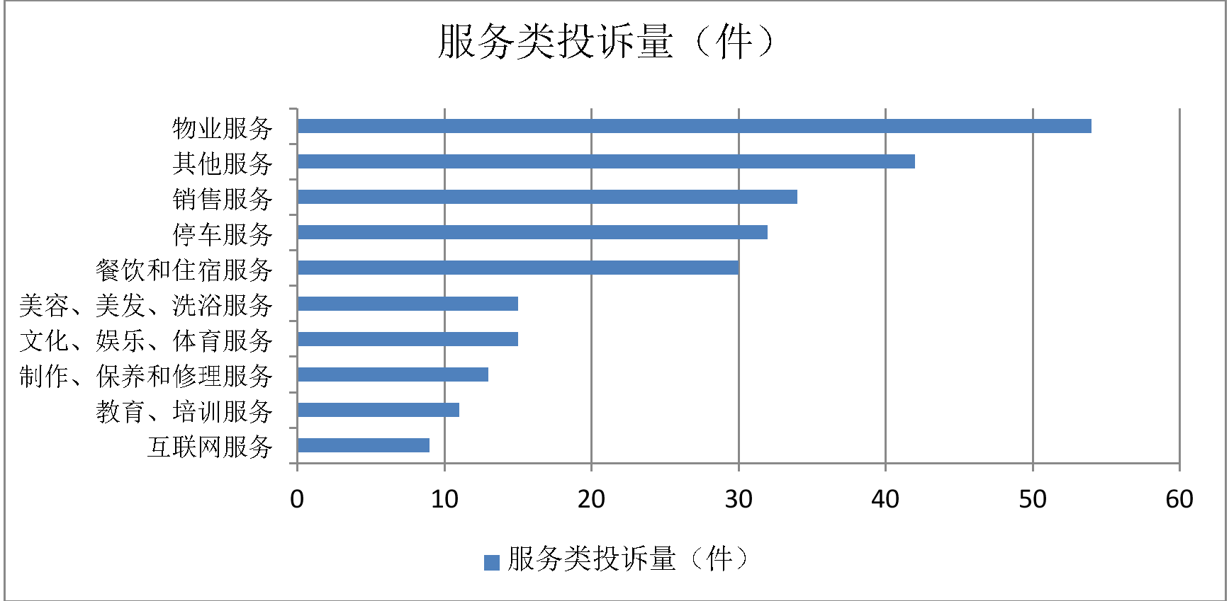 2024年8月,服务类投诉排名前十位的是:物业服务(54件)、其他服务(42件)、销售服务(34件)、停车服务(32件)、餐饮和住宿服务(30件)、文化、娱乐、体育服务(15件)、美容、美发、洗浴服务(15件)、制作、保养和修理服务(13件)、教育、培训服务(11件)、互联网服务(9件)。