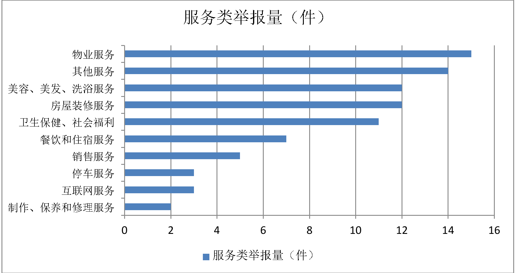 2024年8月,服务类投诉排名前十位的是:物业服务(15件)、其他服务(14件)、房屋装修服务(12件)、美容、美发、洗浴服务(12件)、卫生保健、社会福利(11件)、餐饮和住宿服务(7件)、销售服务(5件)、互联网服务(3件)、停车服务(3件)、制作、保养和修理服务(2件)。