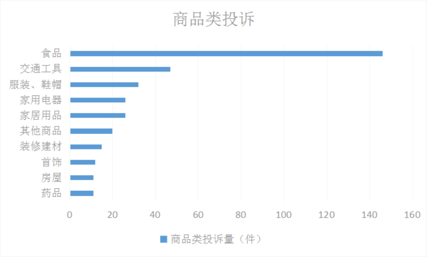 2025年1月,商品类投诉排名前十位的是:食品(146件)、交通工具(47件)、服装和鞋帽(32件)、家用电器(26件)、家居用品(26件)、其他商品(20件)、装修建材(16件)、首饰(12件)、房屋(11件)、药品(11件)。