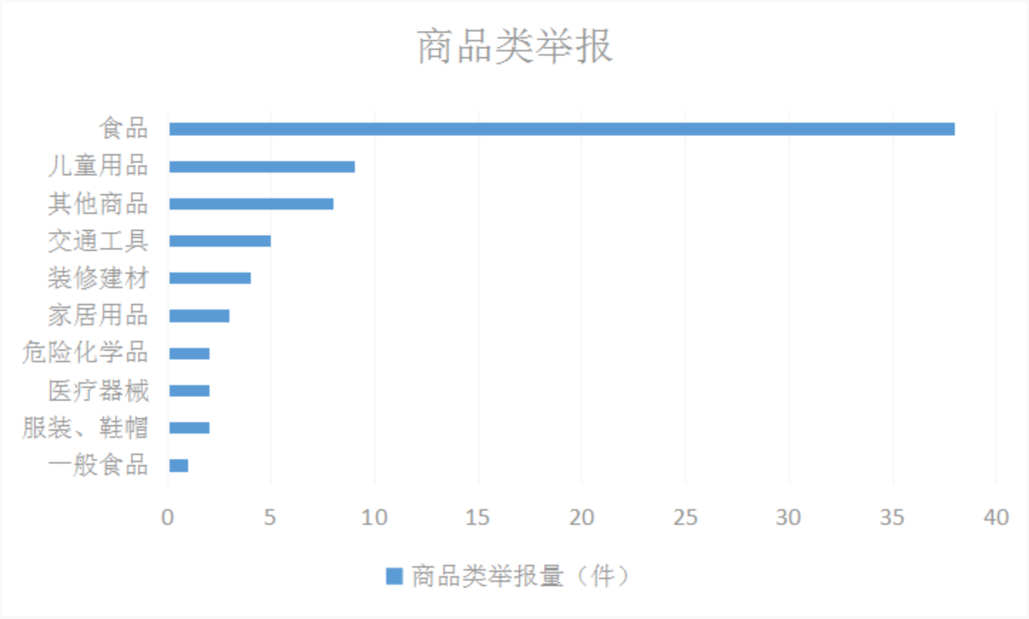 2025年1月,商品类举报排名前十位的是:食品(38件)、儿童用品(9件)、其他商品(8件)、交通工具(5件)、装修建材(4件)、家居用品(3件)、危险化学用品(2件)、医疗器械(2件)、服装和鞋帽(2件)、一般食品(1件)。