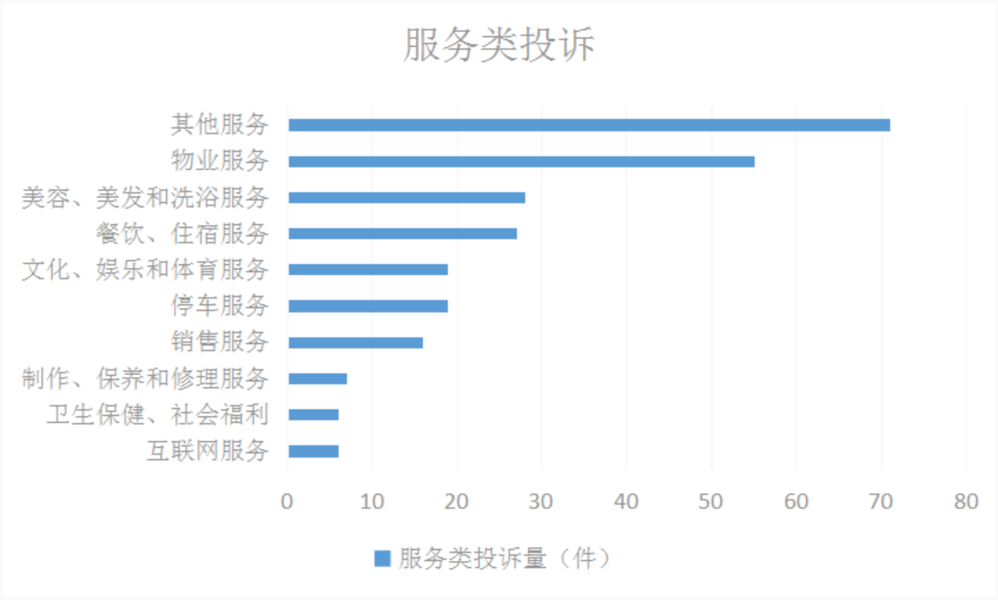 2025年1月,服务类投诉排名前十位的是:其他服务(71件)、物业服务(55件)、美容和美发及洗浴服务(28件)、餐饮和住宿服务(27件)、文化和娱乐及体育服务(19件)、停车服务(19件)、销售服务(16件)、制作和保养及修理服务(7件)、卫生保健和社会福利(6件)、互联网服务(6件)。