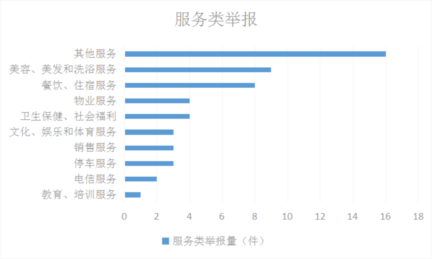 2025年1月,服务类举报排名前十位的是:其他服务(16件)、美容和美发及洗浴服务(9件)、餐饮和住宿服务(8件)、物业服务(4件)、卫生保健和社会福利(4件)、文化和娱乐及体育服务(3件)、销售服务(3件)、停车服务(3件)、电信服务(2件)、教育和培训服务(1件)。