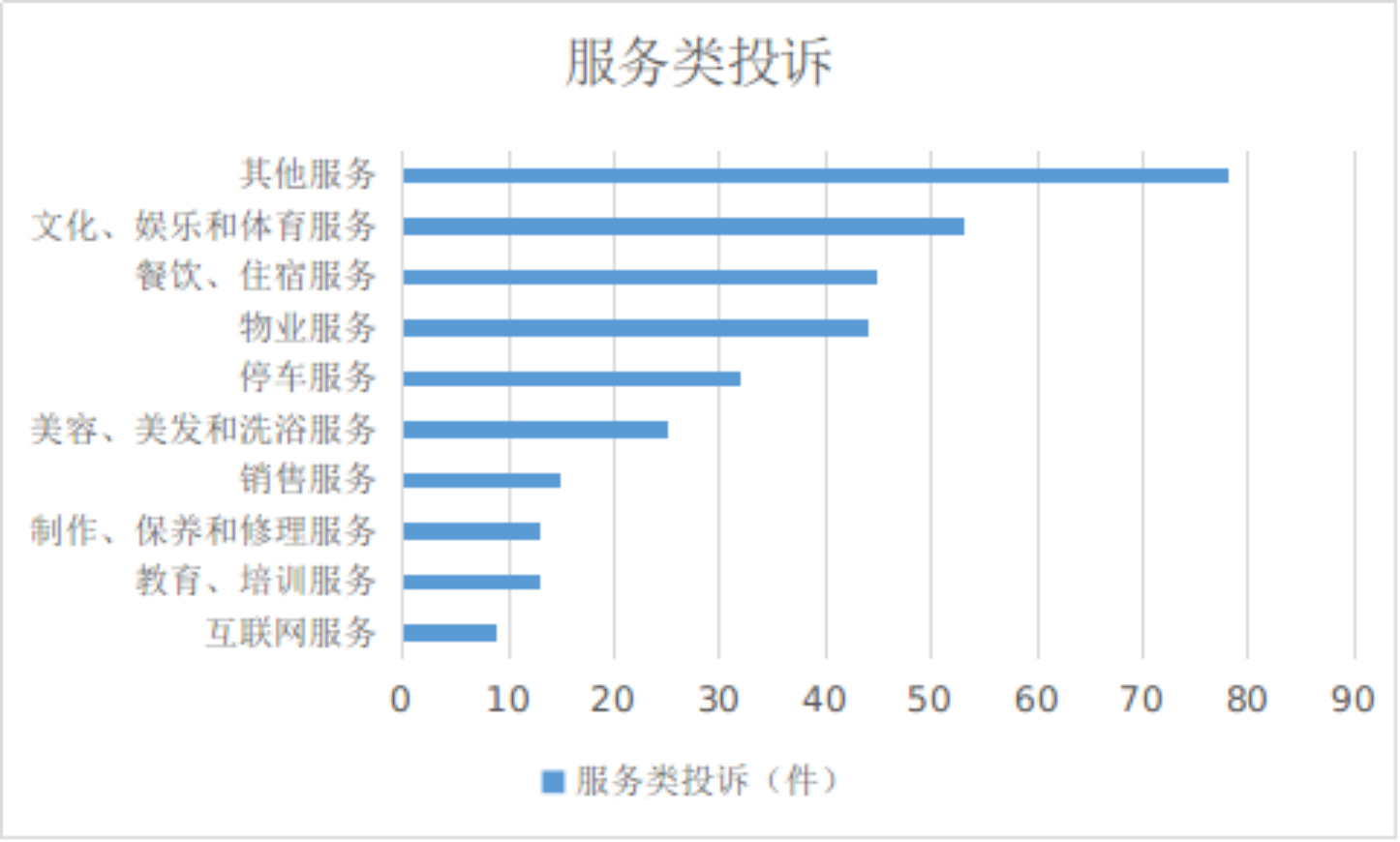 2025年2月,服务类投诉排名前十位的是:其他服务(78件)、文化和娱乐及体育服务(53件)、餐饮和住宿服务(45件)、物业服务(44件)、停车服务(32件)。美容和美发及洗浴服务(25件)、销售服务(15件)、制作和保养及修理服务(13件)、教育和培训服务(13件)。互联网服务(9件)。