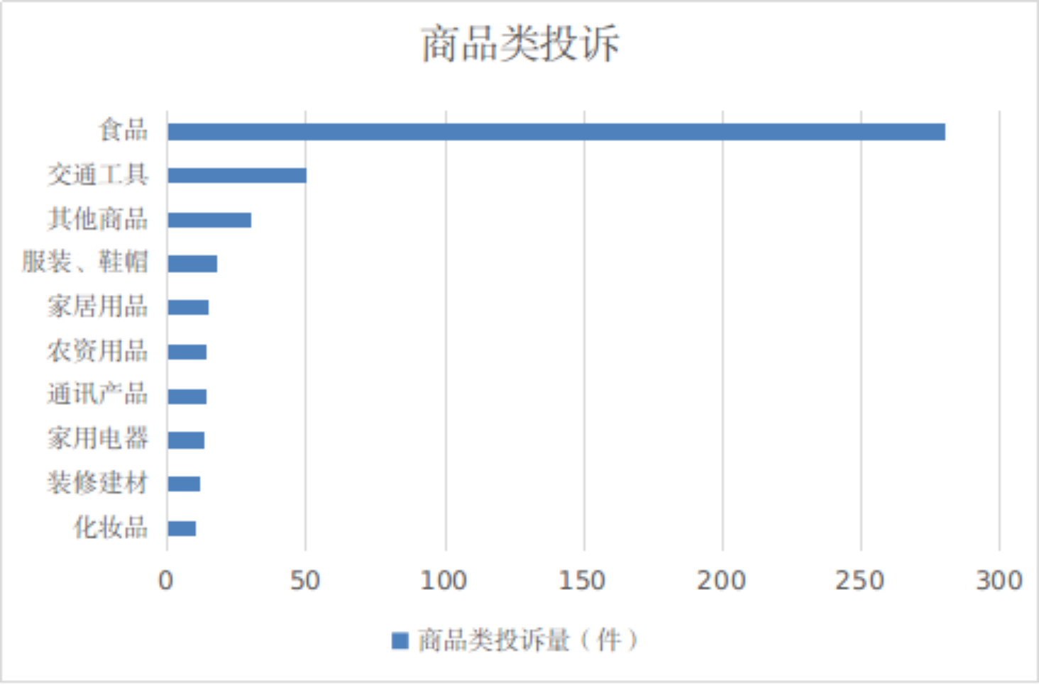 2025年7月,商品类投诉排名前十位的是:食品(280件)、交通工具(50件)、其他商品(30件)、服装、鞋帽(18件)、家居用品(15件)、农资用品(14件)、通讯产品(14件)、家用电器(13件)、装修建材(12件)、化妆品(10件)。