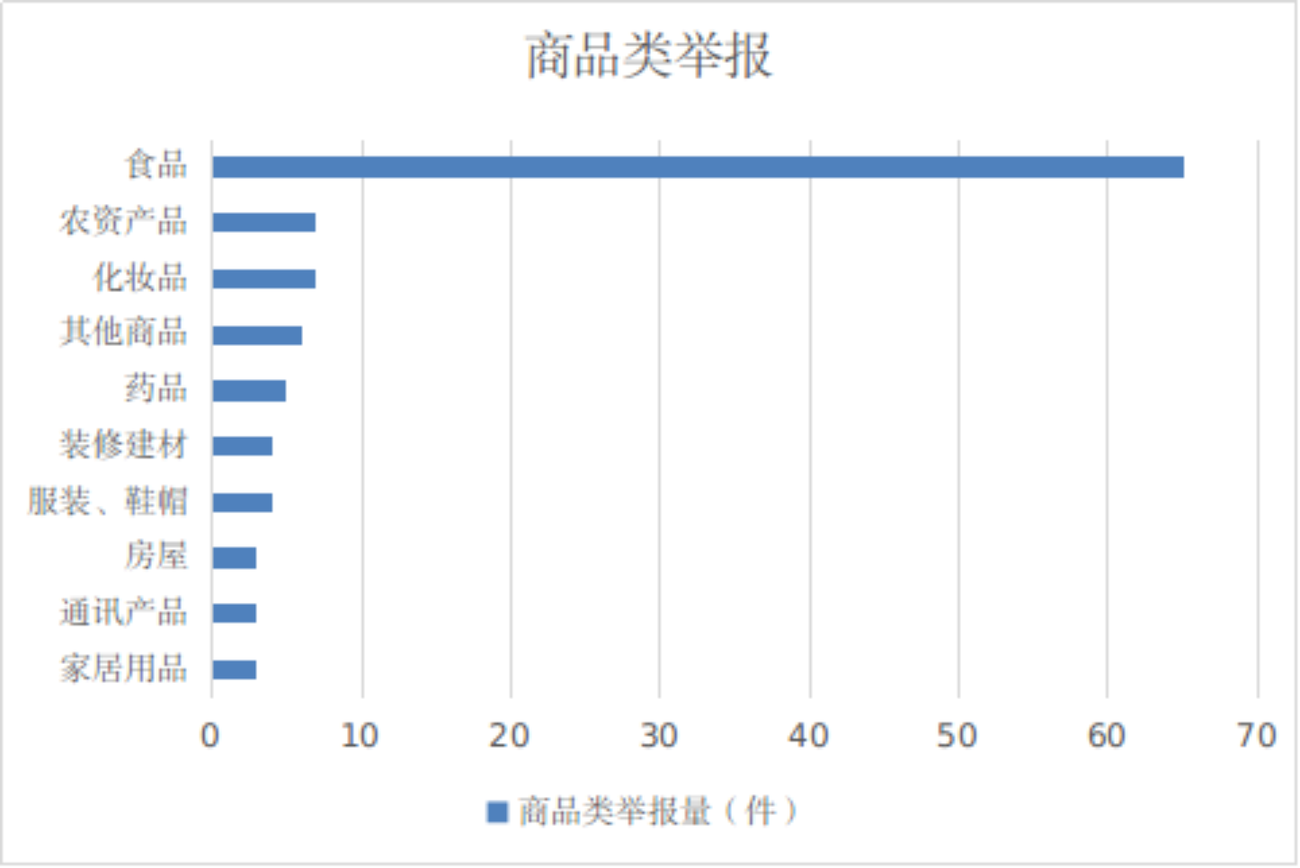 2025年7月,商品类举报排名前十位的是:食品(65件)、农资用品(7件)、化妆品(7件)、其他商品(6件)、药品(5件)、装修建材(4件)、服装、鞋帽(4件)、房屋(3件)、通讯产品(3件)、家居用品(3件)。