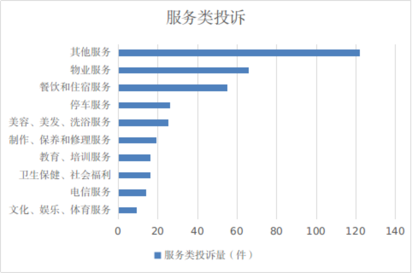 2025年7月,服务类投诉排名前十位的是:其他服务(122件)、物业服务(66件)、餐饮和住宿服务(55件)、停车服务(26件)、美容、美发、洗浴服务(25件)、制作、保养和修理服务(19件)、教育、培训服务(16件)、卫生保健、社会福利(16件)、电信服务(14件)、文化、娱乐、体育服务(9件)。