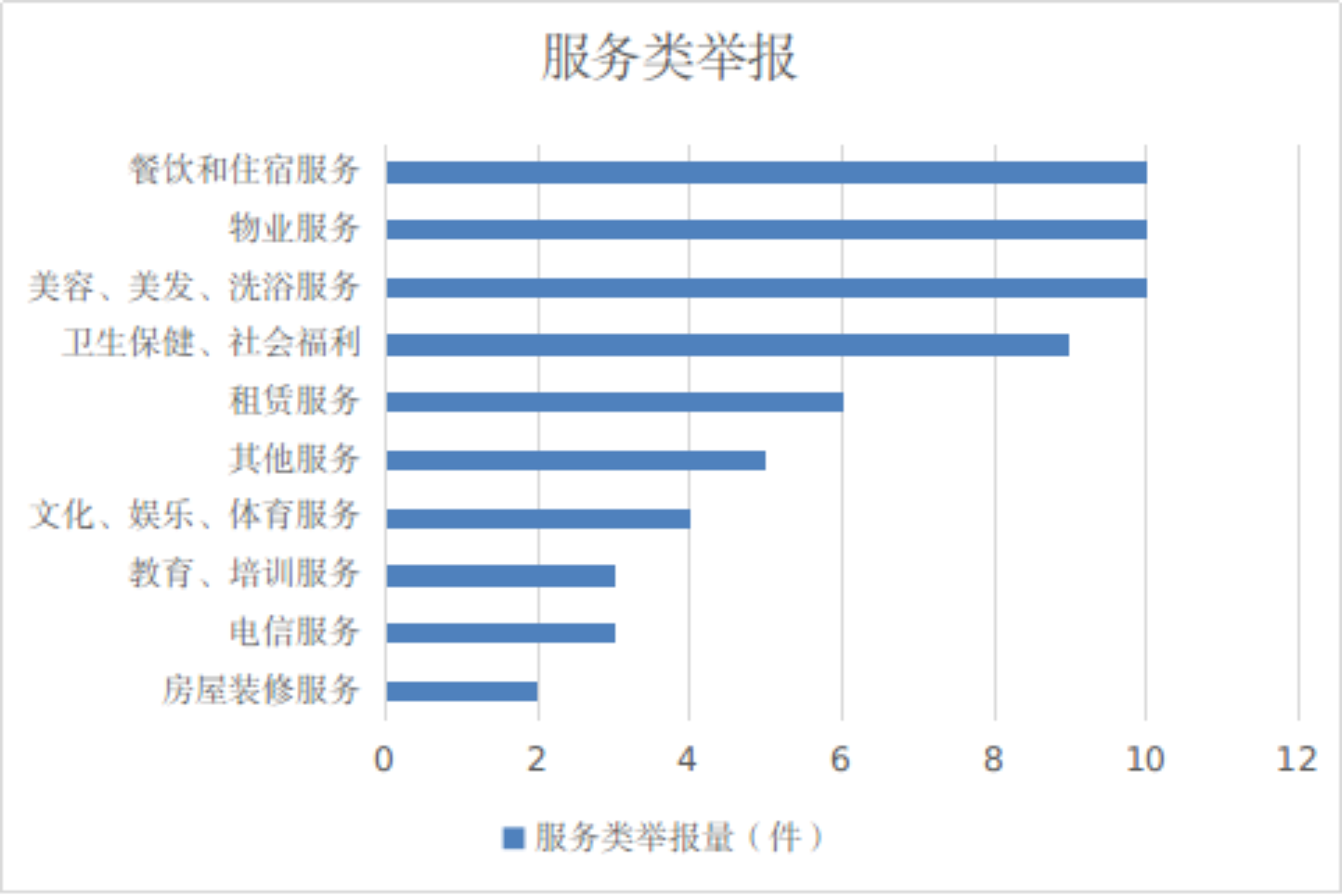2025年7月,服务类举报排名前十位的是:餐饮和住宿服务(10件)、物业服务(10件)、美容、美发、洗浴服务(10件)、卫生保健、社会福利(9件)、租赁服务(6件)、其他服务(5件)、文化、娱乐、体育服务(4件)、教育、培训服务(3件)、电信服务(3件)、房屋装修服务(2件)。