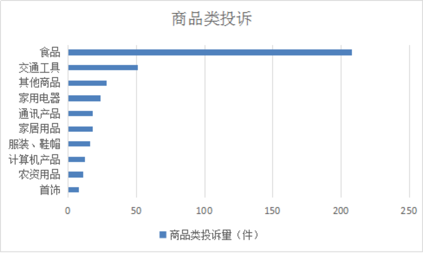 2025年9月,商品类投诉排名前十位的是:食品(208件)、交通工具(51件)、其他商品(28件)、家用电器(24件)、通讯产品(18件)、家居用品(18件)、服装、鞋帽(16件)、 计算机产品(12件)、农资用品(11件)、首饰(8件)。