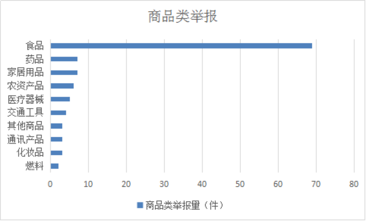 2025年9月,商品类举报排名前十位的是:食品(69件)、药品(7件)、家居用品(7件)、农资用品(6件)、医疗器械(5件)、交通工具(4件)、其他商品(3件)、通讯产品(3件)、化妆品(3件)、燃料(2件)。