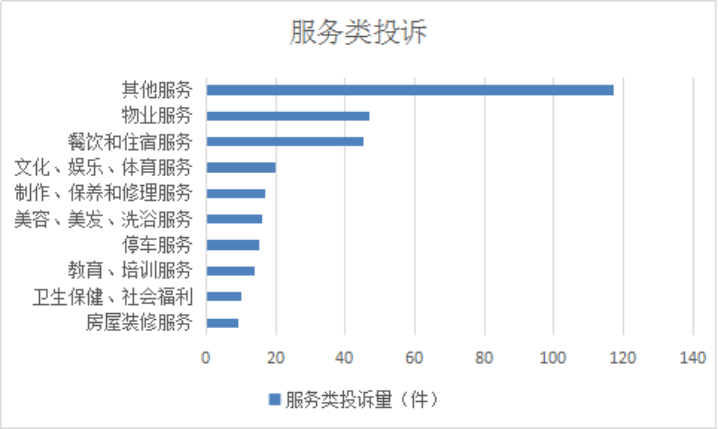 2025年9月,服务类投诉排名前十位的是:其他服务(117件)、物业服务(47件)、餐饮和住宿服务(45件)、文化、娱乐、体育服务(20件)、制作、保养和修理服务(17件)、美容、美发、洗浴服务(16件)、停车服务(15件)、教育、培训服务(14件)、卫生保健、社会福利(10件)、房屋装修服务(9件)。