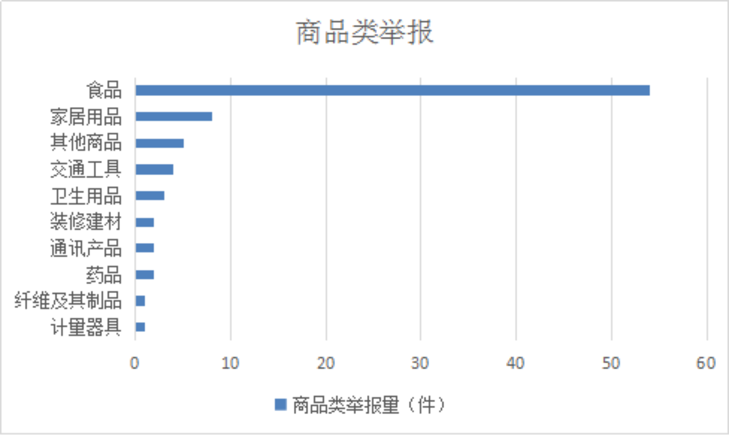 2025年11月,商品类举报排名前十位的是:食品(54件)、家居用品(8件)、其他商品(5件)、交通工具(4件)、卫生用品(3件)、装修建材(2件)、通讯产品(2件)、药品(2件)、纤维及其制品(1件)、计量器具(1件)。
