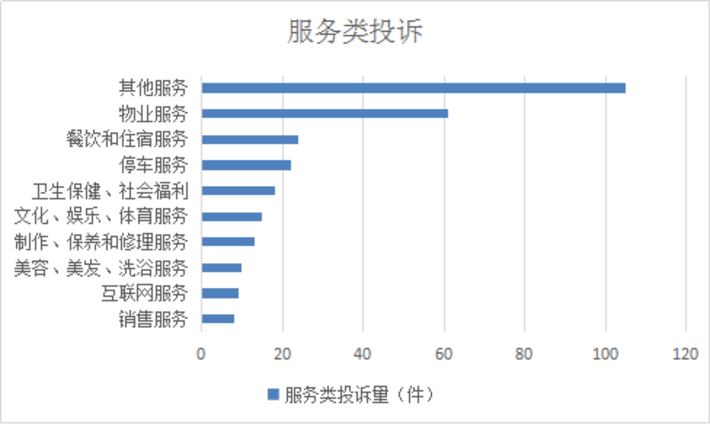 2025年11月,服务类投诉排名前十位的是:其他服务(105件)、物业服务(61件)、餐饮和住宿服务(24件)、停车服务(22件)、卫生保健、社会福利(18件)、文化、娱乐、体育服务(15件)、制作、保养和修理服务(13件)、美容、美发、洗浴服务(10件)、互联网服务(9件)、销售服务(8件)。