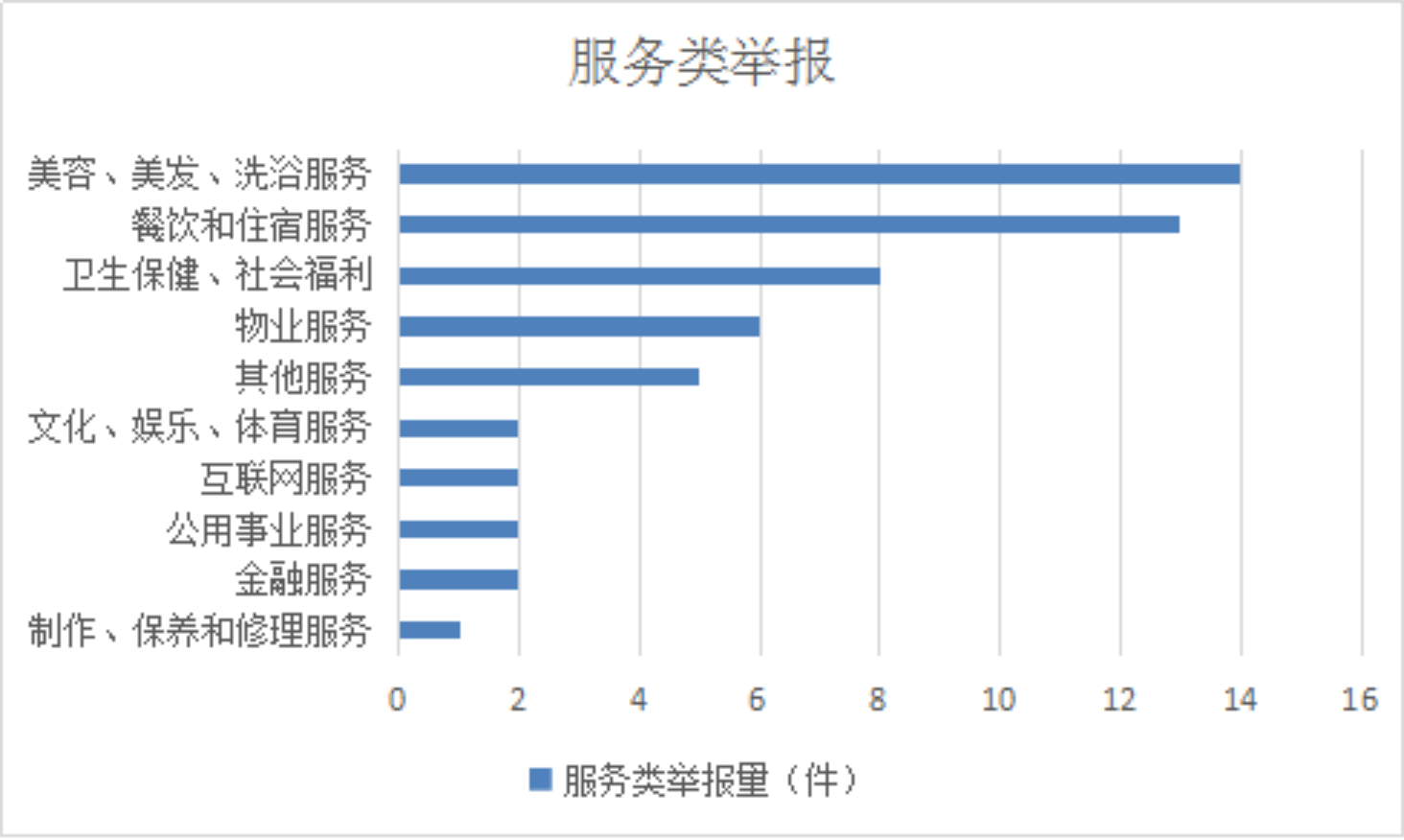 2025年11月,服务类举报排名前十位的是:美容、美发、洗浴服务(14件)、餐饮和住宿服务(13件)、卫生保健、社会福利(8件)、物业服务(6件)、其他服务(5件)、文化、娱乐、体育服务(2件)、互联网服务(2件)、公用事业服务(2件)、金融服务(2件)、制作、保养和修理服务(1件)。