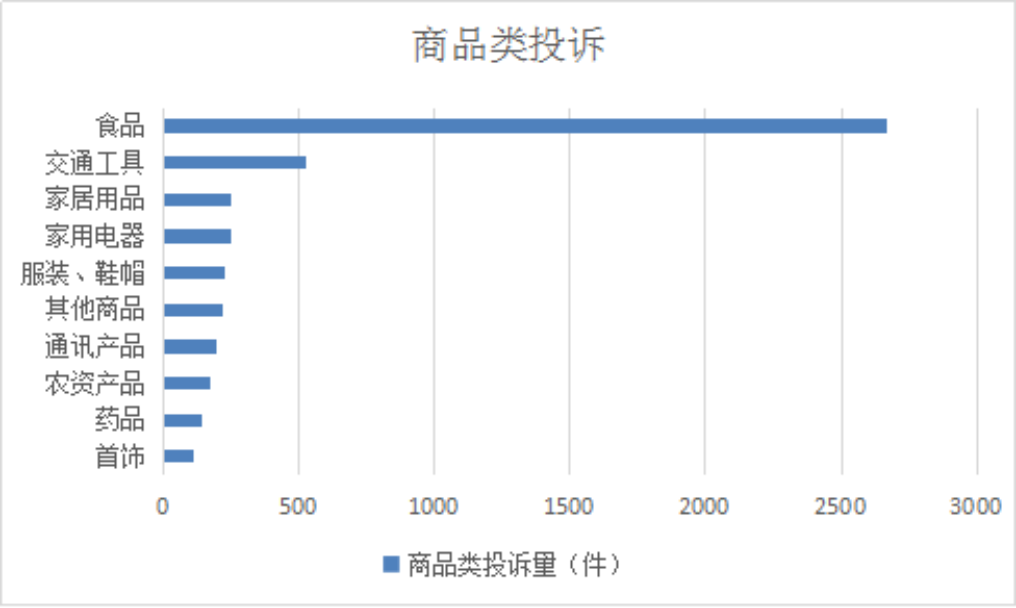 2025年,商品类投诉排名前十位的是:食品(2666件)、交通工具(528件)、家居用品(251件)、家用电器(247件)、服装、鞋帽(223件)、其他商品(217件)、通讯产品(198件)、农资产品(175件)、药品(138件)、首饰(112件)。
