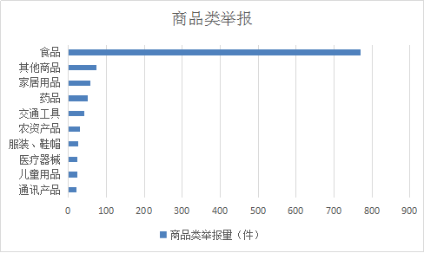 2025年,商品类举报排名前十位的是:食品(770件)、其他商品(75件)、家居用品(57件)、药品(52件)、交通工具(43件)、农资产品(30件)、服装、鞋帽(25件)、医疗器械(23件)、儿童用品(23件)、通讯产品(21件)。