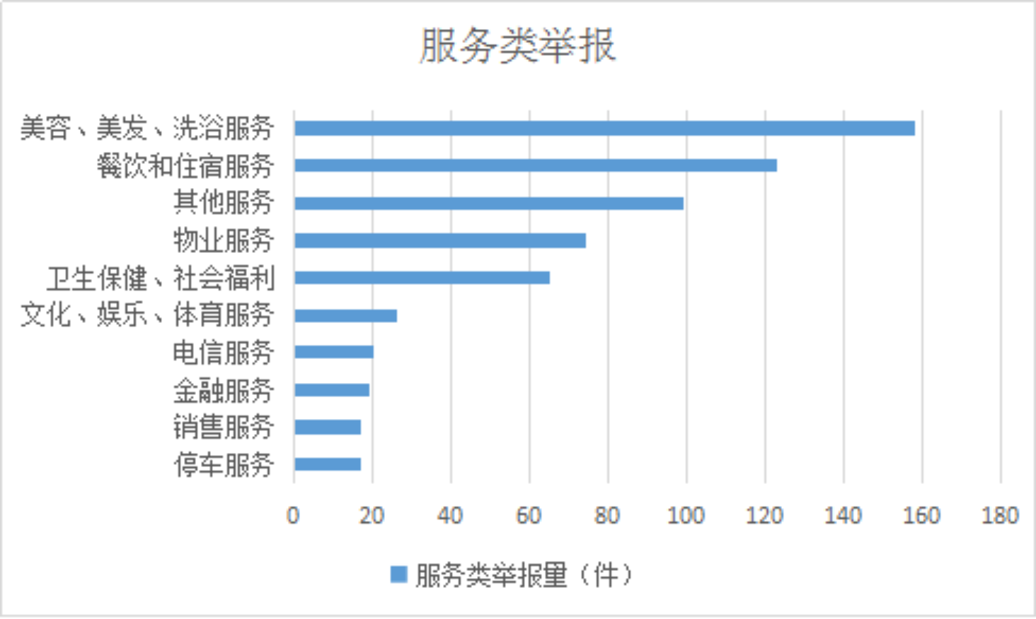 2025年,服务类举报排名前十位的是:美容、美发、洗浴服务(158件)、餐饮和住宿服务(123件)、其他服务(99件)、物业服务(74件)、卫生保健、社会福利(65件)、文化、娱乐、体育服务(26件)、电信服务(20件)、金融服务(19件)、销售服务(17件)、停车服务(17件)。