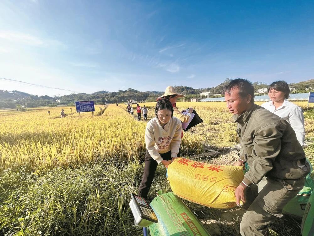 在收割机旁,胡广、冯时钦、陈承娟等农技人员正紧张有序地开展晚稻科学试验的验收及水稻收割工作,经称重、数据记录和观察,如实掌握试验田的化肥利用、单产提升及产量等实时数据。