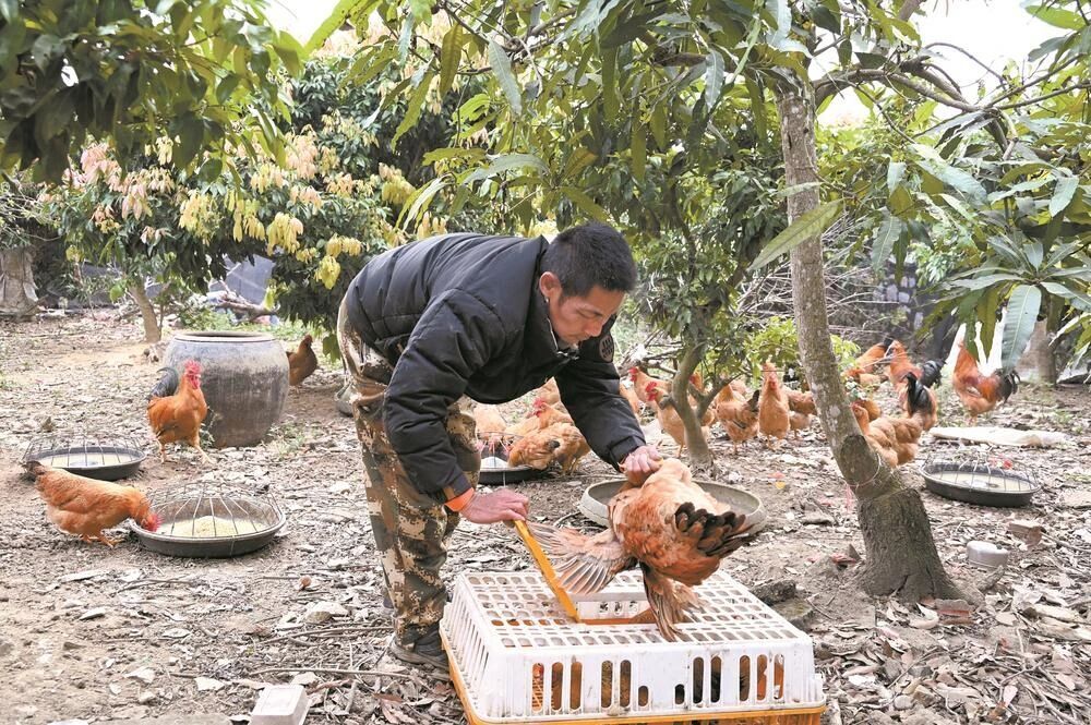 在那隆镇龙窟村脱贫户谢朋祥的果园里,一群群灵山香鸡正悠闲踱步、低头啄食,羽毛在阳光下泛着亮泽。只见谢朋祥看准时机,俯身轻拢,徒手便稳稳捉住一只鸡,动作熟练而轻松。