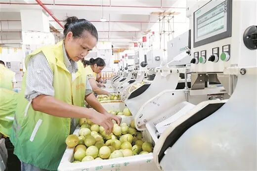 百香果AI分拣线工人正在分类打包装箱。叶尚霖/摄