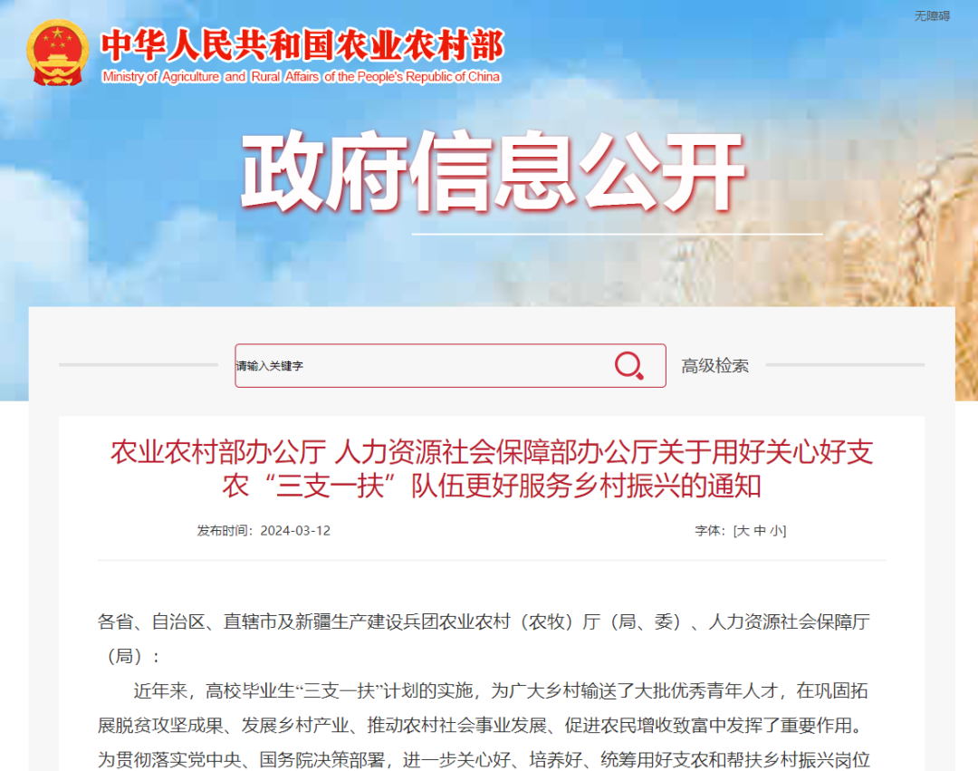 本网讯 近日,农业农村部办公厅、人力资源社会保障部办公厅发布《关于用好关心好支农“三支一扶”队伍更好服务乡村振兴的通知》。进一步关心好、培养好、统筹用好支农和帮扶乡村振兴岗位“三支一扶”人员(以下统称支农人员),引导支持其主动扎根基层联农带农益农,激发释放更多创新创造活力,更好服务全面推进乡村振兴、加快建设农业强国。