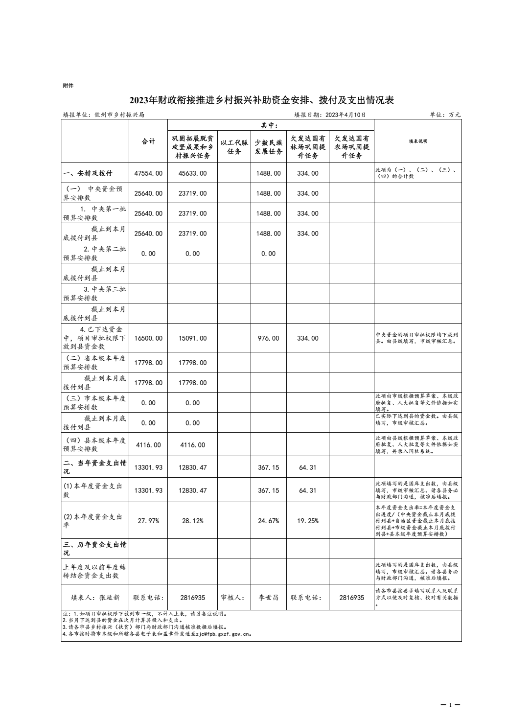 钦州市2023年财政衔接推进乡村振兴补助资金安排、拨付及支出情况表(3月)