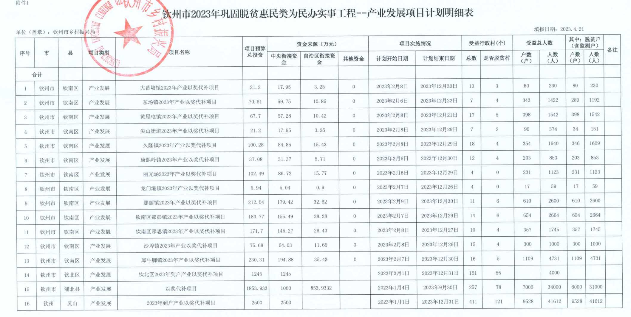钦州市2023年巩固脱贫惠民类办实事工程—产业发展项目计划明细表