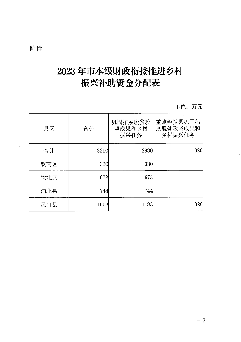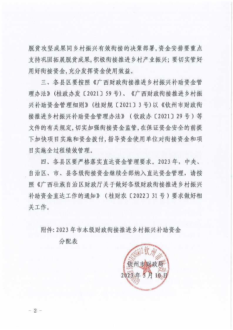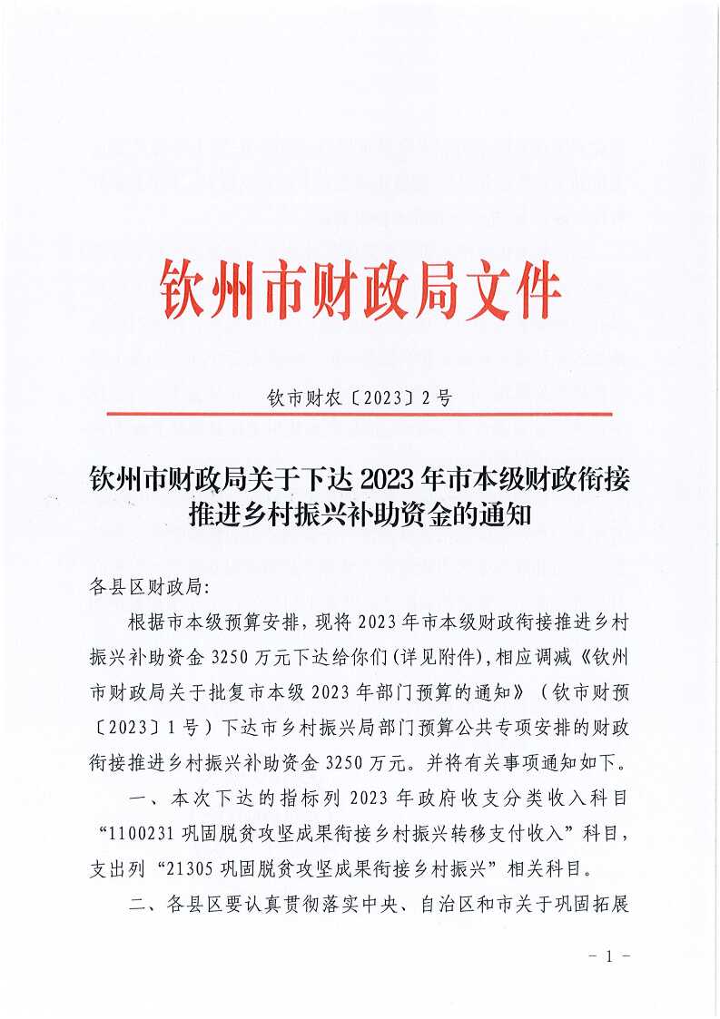 钦州市财政局关于下达2023年市本级财政衔接推进乡村振兴补助资金的通知