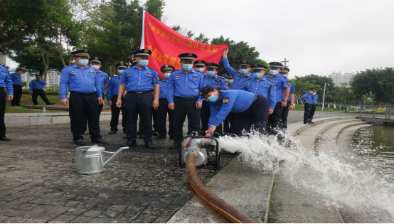 演练中,参演队员按照先后顺序进入预演现场,首先是抽水机规范使用操作演练,要求参演城管队员个个练习操作,并且人人过关。