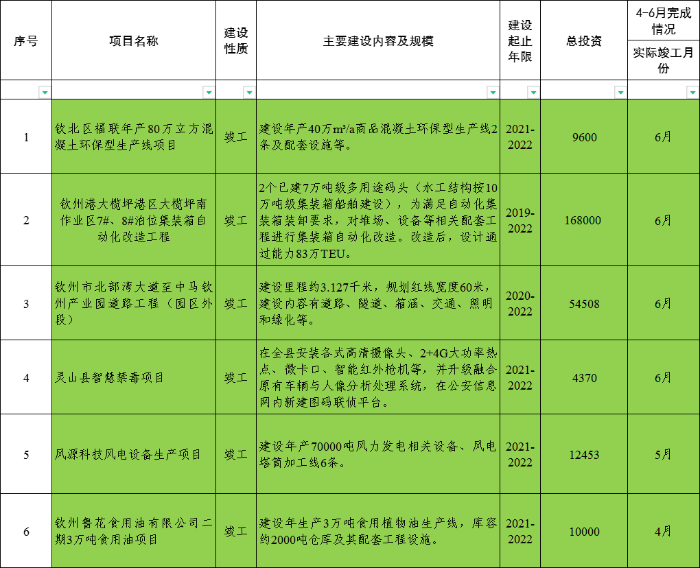 2022年重大建设项目竣工项目汇总表(4月-6月)