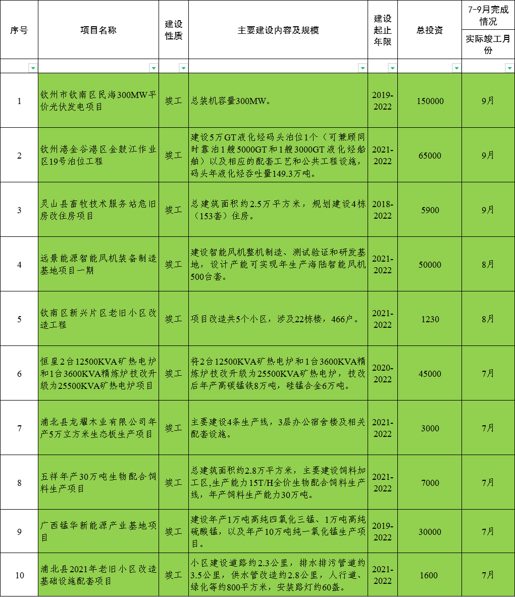 2022年重大建设项目竣工项目汇总表(7月-9月)