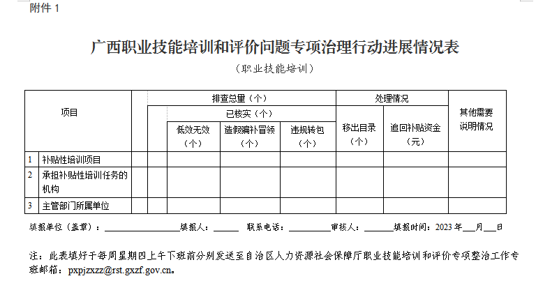 附件:1.广西职业技能培训和评价问题专项治理行动进展情况表(职业技能培训)