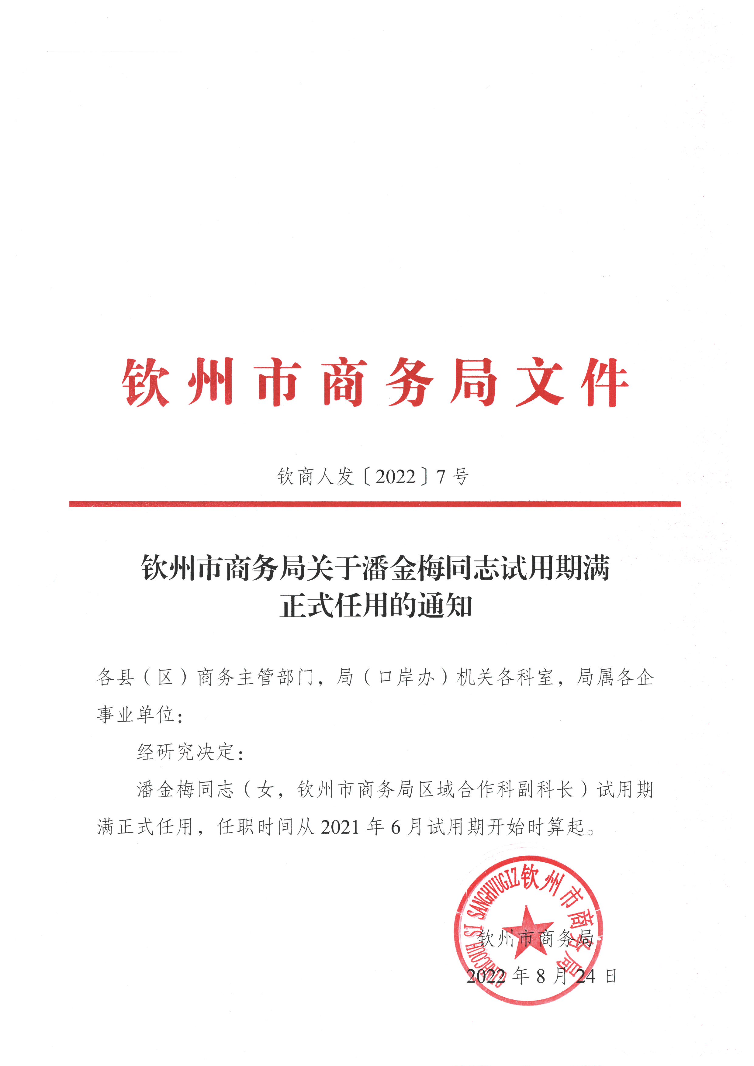钦州市商务局关于潘金梅同志试用期满正式任用的通知