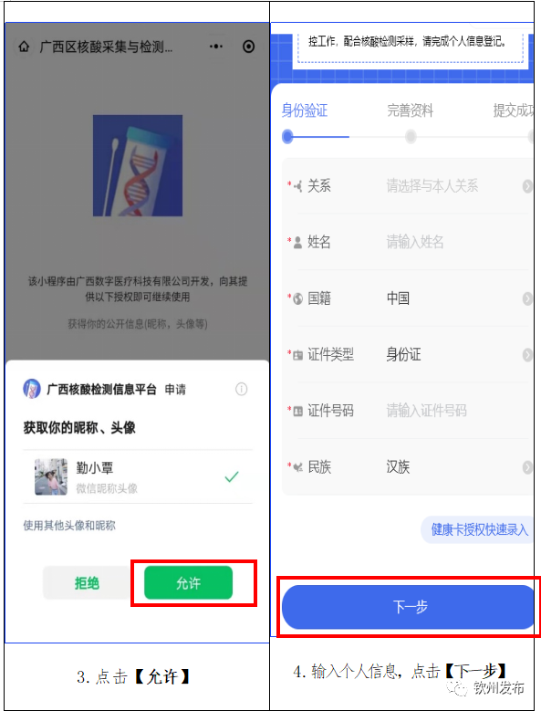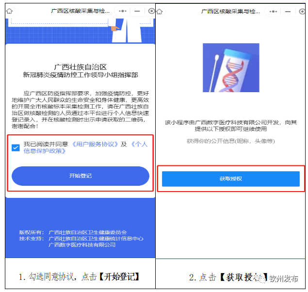 点击、勾选同意协议,点击【开始登记】——点击【获取授权】——点击【允许】——输入个人信息,点击下一步,完善个人资料,点击【提交】,直至显示个人绿码,即完成授权登记。具体操作如下图所示: