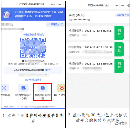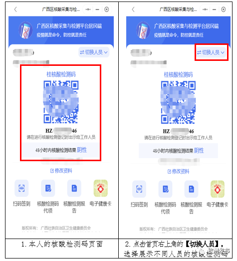用户想查询自己的核酸检测结果可通过桂核酸检测码首页的【核酸检测报告】查询自己的核酸检测结果,也可通过【切换人员】查看代领人员的核酸检测结果。具体操作如下图所示: