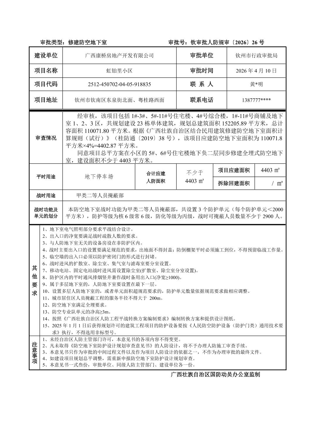 发文字号:钦审批人防规审〔2026〕26号