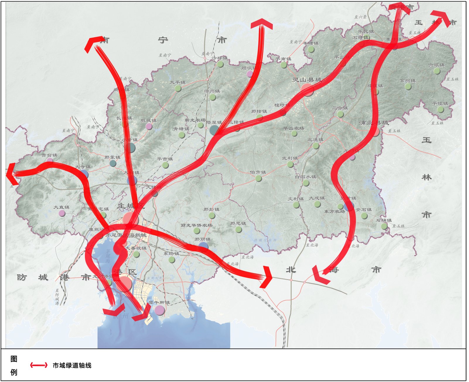 (1)市域绿道结构。规划市域形成五条绿道轴线,分别为中心城区-灵山县绿道轴、中心城区环城绿道轴、主城区-新棠绿道轴、主城区-贵台绿道轴以及浦北县绿道轴。