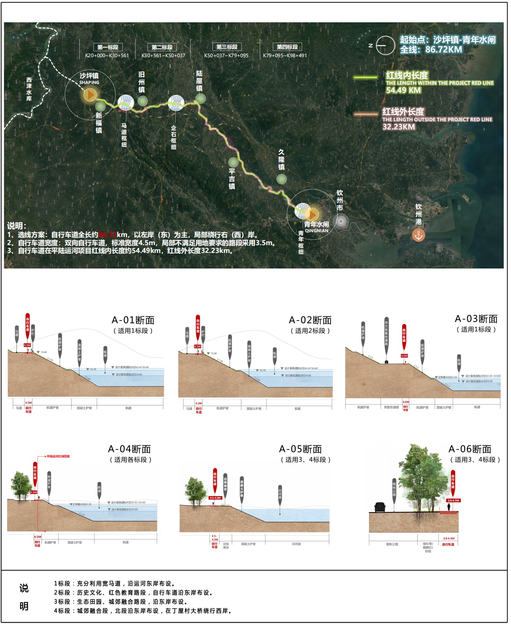 全线自行车道以布设在平陆运河东岸为主,局部绕行西岸。自行车道宽度按照满足双向通行的标准设置,标准宽度为4.5m,局部不满足用地要求的路段采用3.5m。全线分为4个标段,根据沿线不同的用地条件设置6种类型指引断面。
