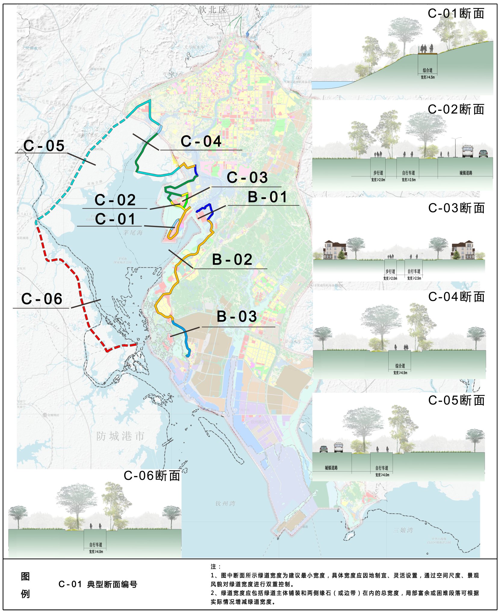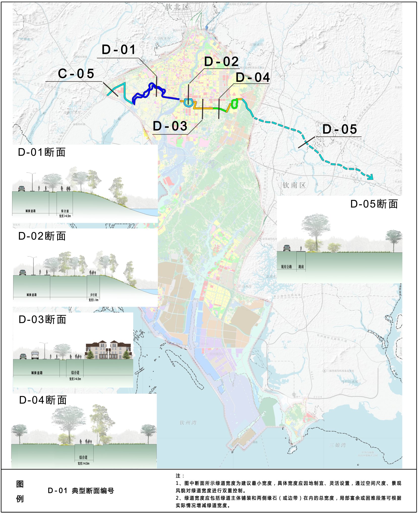 D-04断面:在钦州园博园以及城镇规划建设用地范围外,利用绿地空间设置步行和自行车综合道,综合道宽度不宜小于4.5m。
