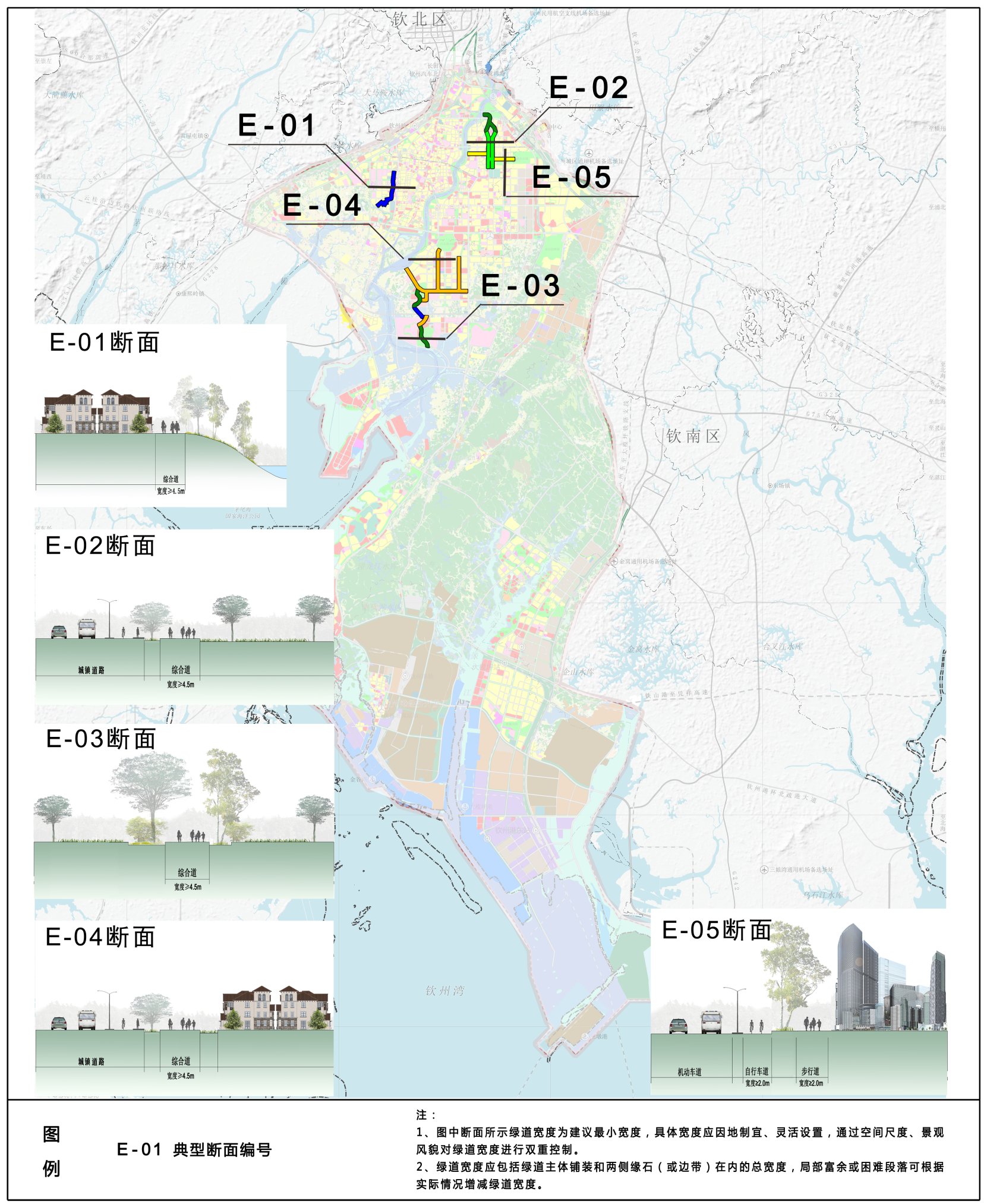E-01断面:结合滨水岸线空间,设置步行和自行车综合道,宽度不宜小于4.5m。