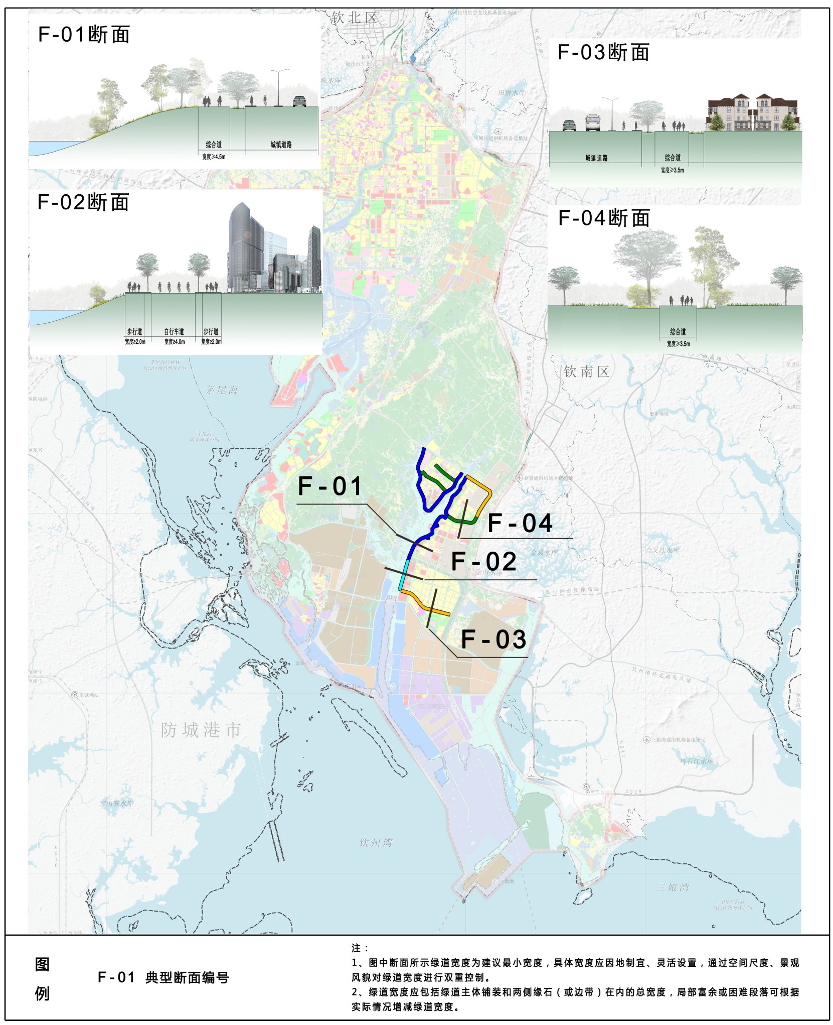 F-01断面:结合滨水绿化空间,设置步行和自行车综合道,综合道宽度不宜小于4.5m。该断面主要适用于金鼓江沿线段。