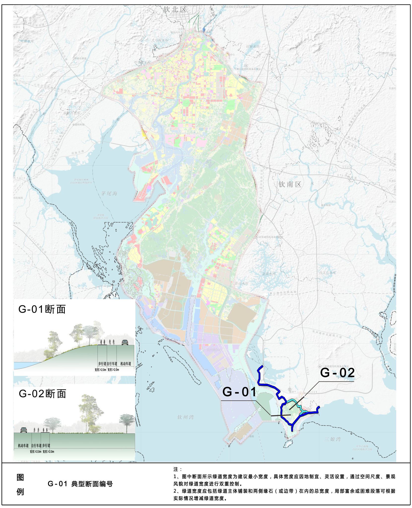 G-01断面:结合海堤路及滨海绿化布设绿道,单侧步行道、自行车道宽度均不宜小于2.0m,均采用彩色铺装以与一般的自行车道及人行道做区分。